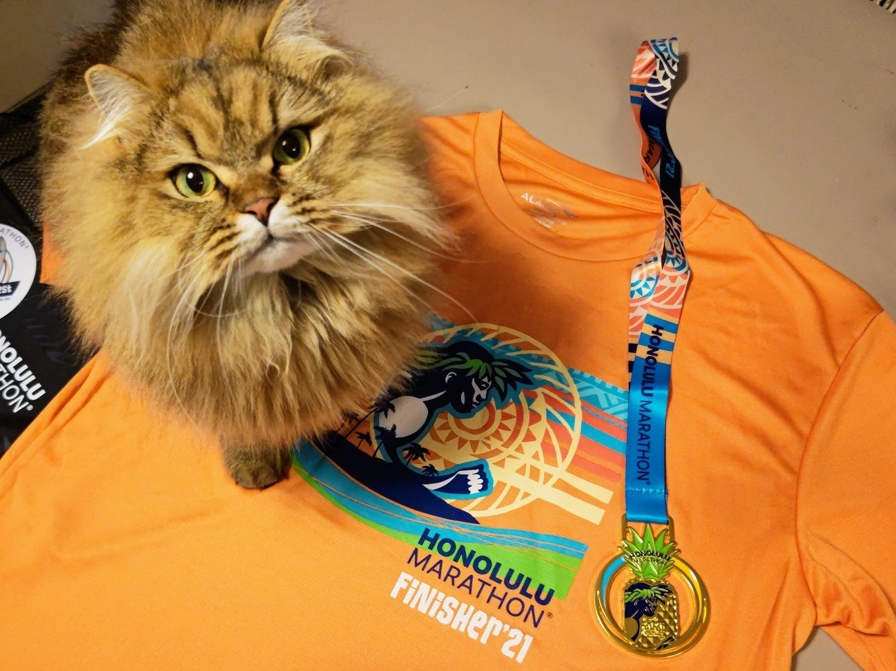 私は現地参加でしたので、バーチャルの完走Tはノーマークでした。オレンジ色が猫毛の色と同化していて、色彩効果が出ていますね。