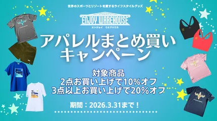 【本日スタート】 アパレルまとめ買いで最大20%OFF! JALホノルルマラソンのオフィシャルECショップ「ENJOY WAREHOUSE 」では、本日よりアパレルのまとめ買いキャンペーンをスタートしました。 ご夫婦やカップル、お友達、ご家族など、皆さまでのご購入も大歓迎。ランニング用に揃えるのはもちろん、色違いやサイズ違いでのおまとめ買いにもぴ