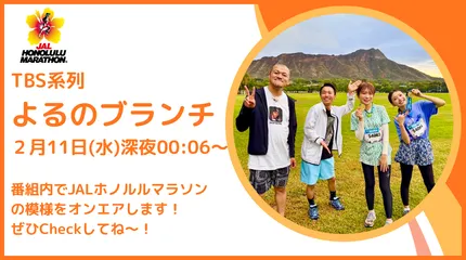 2月11日(水) 「よるのブランチ」で10kmラン&ウォークの様子を放送 2月11日放送の「よるのブランチ」(0時6分~1時5分)で、JALホノルルマラソンが紹介されます!元乃木坂46キャプテンの秋元真夏さんと王様のブランチ リポーターの日向未来さんの2人が10キロラン&ウォークに参加した様子をお届けします。ハワイの空気感、沿道の雰囲気、そしてお二人の楽しそうな表情…きっ