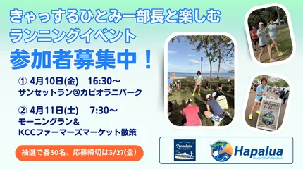 きゃっするひとみーと楽しむランイベント@ホノルル|ホノルルランニングクラブ by ホノルルマラソン× TOKYO FM ALL TIME BEST ホノルルハーフマラソン ハパルア2026では、昨年に引き続き、レース前にみんなで集まって楽しむホノルル現地でのランニングイベントを開催します!皆さんとイベントを盛り上げ、力強くサポートしてくれるのは、HONOLULU RUNNING CLUB部長のきゃっするひとみーさん。夕暮れのカピオラにパークを走