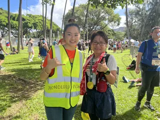 還暦記念のホノマラ 友人のお嬢さん(とは初対面)が現地ボランティアをされていたので無事にゴールした後の記念撮影