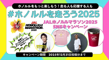 JALホノルルマラソン2025では、ご自身のアカウントでご参加いただき、豪華賞品が抽選で当たるSNSキャンペーンを12月31日(火)まで実施中!応募は簡単、JALホノルルマラソン公式SNS (Instagram/X/Facebook)をフォローの上「#ホノルルを走ろう2025」をつけてご自身のアカウ